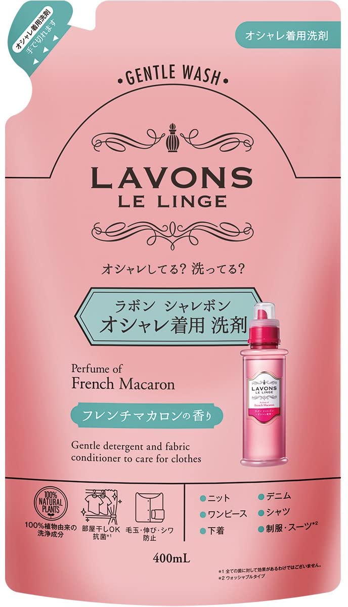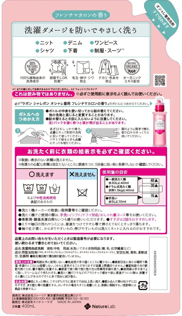 サイズ名:400ml商品紹介洗濯ダメージを防いでやさしく洗う、ラボンのオシャレ着用洗剤。 毛玉・伸び・シワや、テカリ・色あせを防いで、大切な洋服をキレイに保ちます。 上質な甘さが華やかに香るフルーティフローラル系、フレンチマカロンの香り。 ●植物由来の洗浄成分 ●部屋干しOK、抗菌(全ての菌に対して効果があるわけではございません) ●オーガニックエキス配合 ●ニット、デニム、ワンピース、シャツ、下着、制服・スーツ(ウォッシャブルタイプ)などに ※パッケージデザイン等は予告なく変更されることがあります原材料・成分界面活性剤(19%、ポリオキシアルキレンアルキルアミン、ポリオキシエチレンアルキルエーテル)、安定化剤、香料、柔軟成分、抗菌剤 ●蛍光増白剤や漂白剤を配合していません。