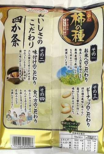 おつまみにもお茶請けにもぴったりな三幸の柿の種。昔ながらの素材と杵つき製法にこだわり、水稲もち米を100%使用したお米風味豊かな柿の種です。コク・旨み・香りのある醤油味に仕上げました。便利な食べきりサイズ6袋入り。ピーナッツ入りで食べ飽きることなく最後まで楽しめます。