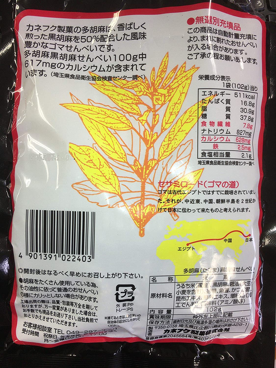 香ばしい胡麻の香りと風味を存分に味わうことができるおせんべいです。カネフク製菓の多胡麻は、香ばしく炒った黒胡麻を50%配合した風味豊かなゴマせんべいです。多胡麻黒胡麻せんべい100g中617mgのカルシウムが含まれています。