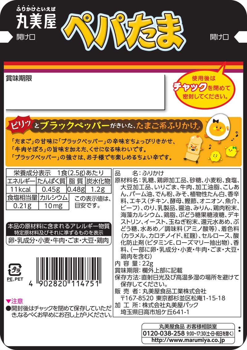 商品紹介ピリッとブラックペッパーの効いた、たまご系ふりかけです。 「たまご」の甘味に「ブラックペッパー」の辛味をちょっぴり効かせた大人味覚の味わいが楽しめます。 ご家庭で、大人から子供まで、みんなで楽しめるちょい辛な味わいです。 小容量タイプのふりかけです。原材料・成分乳糖、鶏卵加工品、砂糖、小麦粉、食塩、大豆加工品、いりごま、牛肉、加工油脂、こしあん、パーム油、でん粉、みそ、植物性たん白、香辛料、エキス(チキン、酵母、鰹節、オニオン、魚介、ビーフ)、のり、乳製品、醤油、みりん、鶏肉粉末、海藻カルシウム、鶏脂、ぶどう糖果糖液糖、デキストリン、イースト、玉ねぎ粉末、還元水あめ、ぶどう糖、水あめ/調味料(アミノ酸等)、着色料(カラメル、カロチノイド、紅麹)、セルロース、酸化防止剤(ビタミンE、ローズマリー抽出物)、香料、(一部に卵・乳成分・小麦・牛肉・ごま・大豆・鶏肉を含む)
