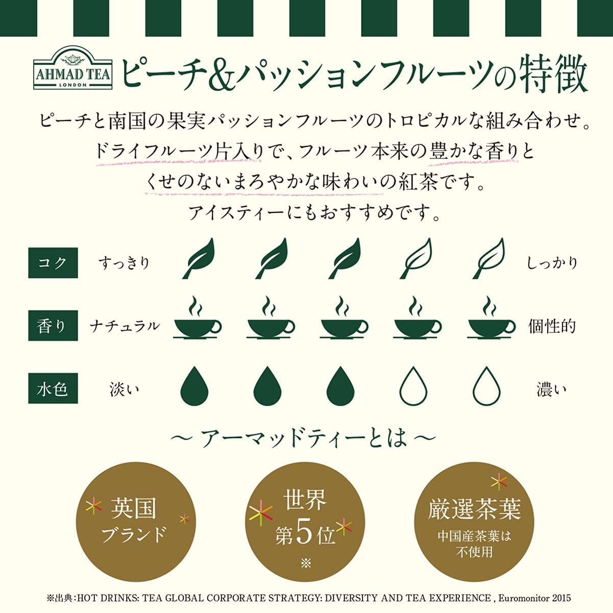 ・原材料:紅茶、香料(ベルガモット) ・内容量:2g×20包×3個 ・商品サイズ(高さx奥行x幅):20.7cm×13cm×7.9cm ・ ・ 【商品詳細】 商品紹介アーマッドティーならではのピーチと南国の果実パッションフルーツのトロピカルな組み合わせ。ドライフルーツ片入りで、フルーツ本来の豊かな香りとくせのないまろやかな味わいの紅茶です。アイスティーにも。〈アルミ個包装〉アーマッドティーは50年以上も昔に、「高品質な紅茶を、もっと手軽に飲んで欲しい」という一人の英国人の強い思いから生まれました。今日も「高品質」「良心価格」の基本理念としてその精神は脈々と受け継がれています。原材料・成分紅茶、香料(ベルガモット)使用方法抽出時間 3分~3分半続きを見る