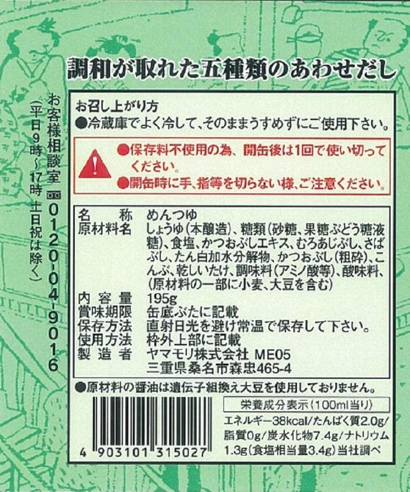 商品紹介昭和48年発売の「名代」ブランドのロングセラー商品です。使いきりタイプの缶入り(195g)の本品と、400mlペットボトル・お徳用500mlペットボトルもラインナップしています。香り、コク、旨みのバランスがとれ、だしの香りがやわらかく口当たりがまろやかです。原材料・成分しょうゆ(本醸造)、糖類(砂糖、果糖ぶどう糖液糖)、食塩、かつおぶしエキス、むろあじぶし、さばぶし、たん白加水分解物、かつおぶし(粗砕)、こんぶ、乾しいたけ、調味料(アミノ酸等)、酸味料、(原材料の一部に小麦、大豆を含む)