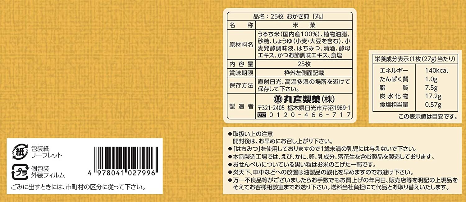 ・原材料:うるち米(国内産100%)、植物油脂、砂糖、しょうゆ(小麦・大豆を含む)、小麦発酵調味液、はちみつ、清酒、酵母エキス、かつお節調味エキス、食塩