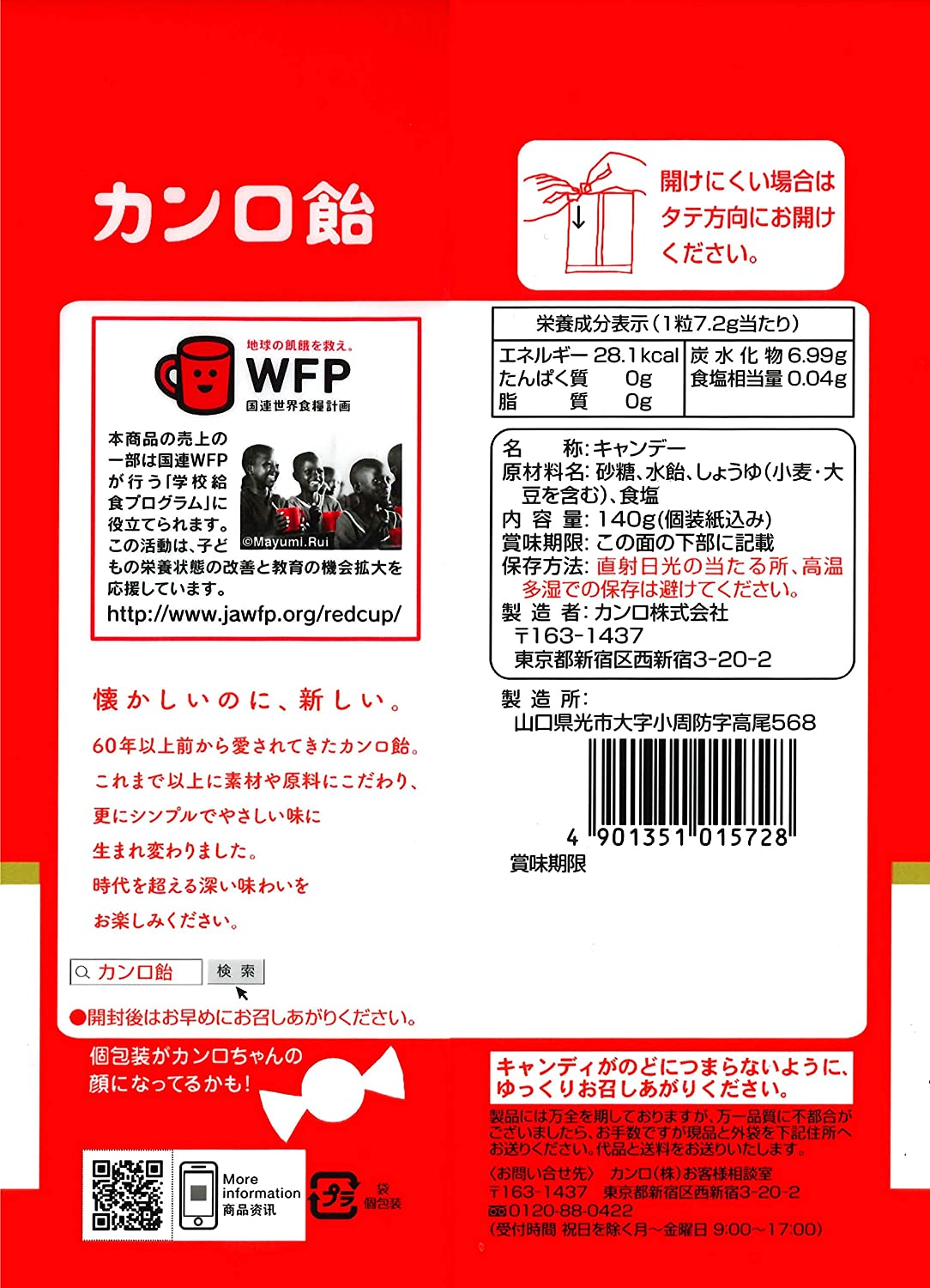 商品紹介・おいしさはそのままに、原材料から「調味料(アミノ酸)」をなくし、「砂糖、水飴、しょうゆ、食塩」の素材だけで作られたシンプルなおいしさに変更 ・商品のデザインを、新CIに合わせて大幅に刷新。香料着色料不使用マークと英語表記も追加。 ・包材のバリア性を高め、飴のべたつきを低減 ・あまじょっぱい和のおいしさに、どこか懐かしさを感じてほっとする日本の伝統的な飴 ・香料、着色料不使用 ・独特の旨みを持つ、特別に醸造したカンロ飴専用醤油を使用原材料・成分砂糖、水飴、しょうゆ(小麦・大豆を含む)、食塩