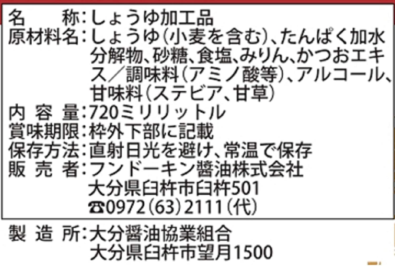 ・原材料:しょうゆ、たんぱく加水分解物、砂糖、糖みつ、食塩、水あめ、みりん、かつおエキス、こんぶエキス、調味料(アミノ酸等)、アルコール、カラメル色素、甘味料(ステビア、甘草)、(原材料の一部に小麦を含む)