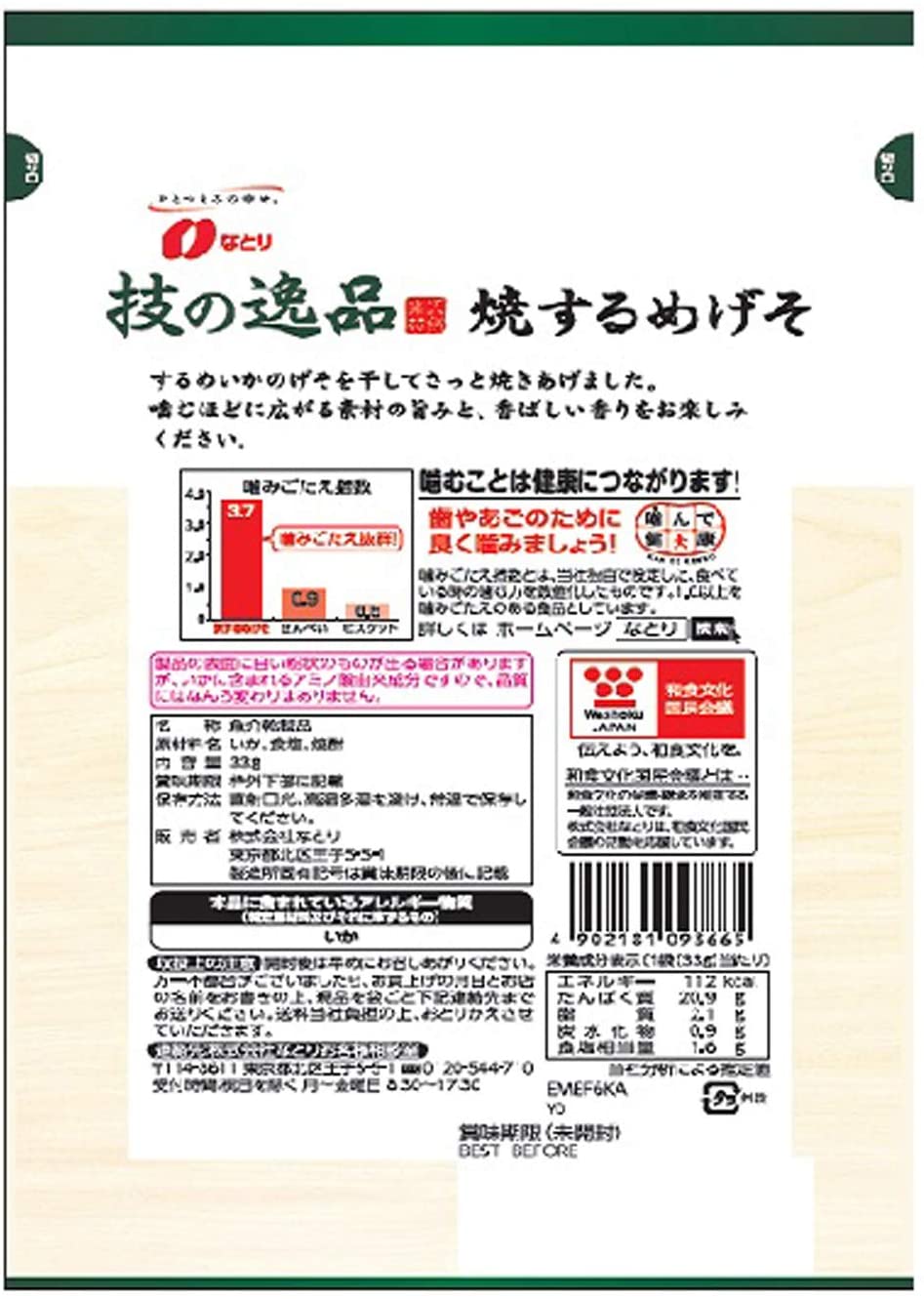食品添加物を使用せず、「天然素材」だけで仕上げました。国産するめいかのげそを干してさっと焼き上げました。噛むほどに広がる素材の旨みと、香ばしい香りをお楽しみください。尚、製品の表面に白い粉状のものが出る場合がありますが、これはいかに含まれるアミノ酸由来成分ですので、品質には何ら変わりはありません。1袋(33g)当たり:エネルギー112kcal たんぱく質 20.9g 脂質 2.1g 炭水化物 0.9g 食塩相当量 1.6g