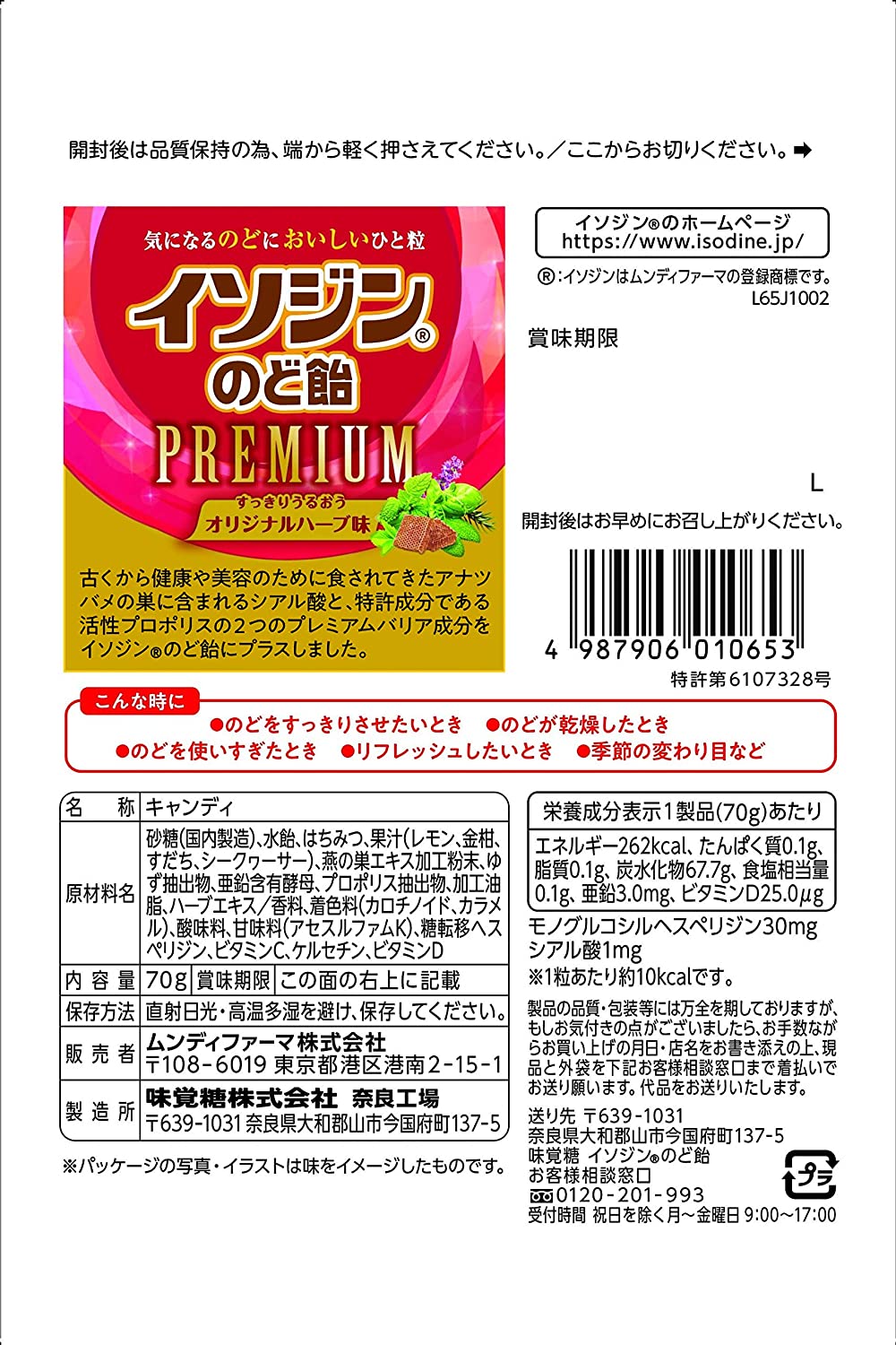 UHA味覚糖 イソジンのど飴 PREMIUMプレミアム オリジナルハーブ味 70g ×6袋