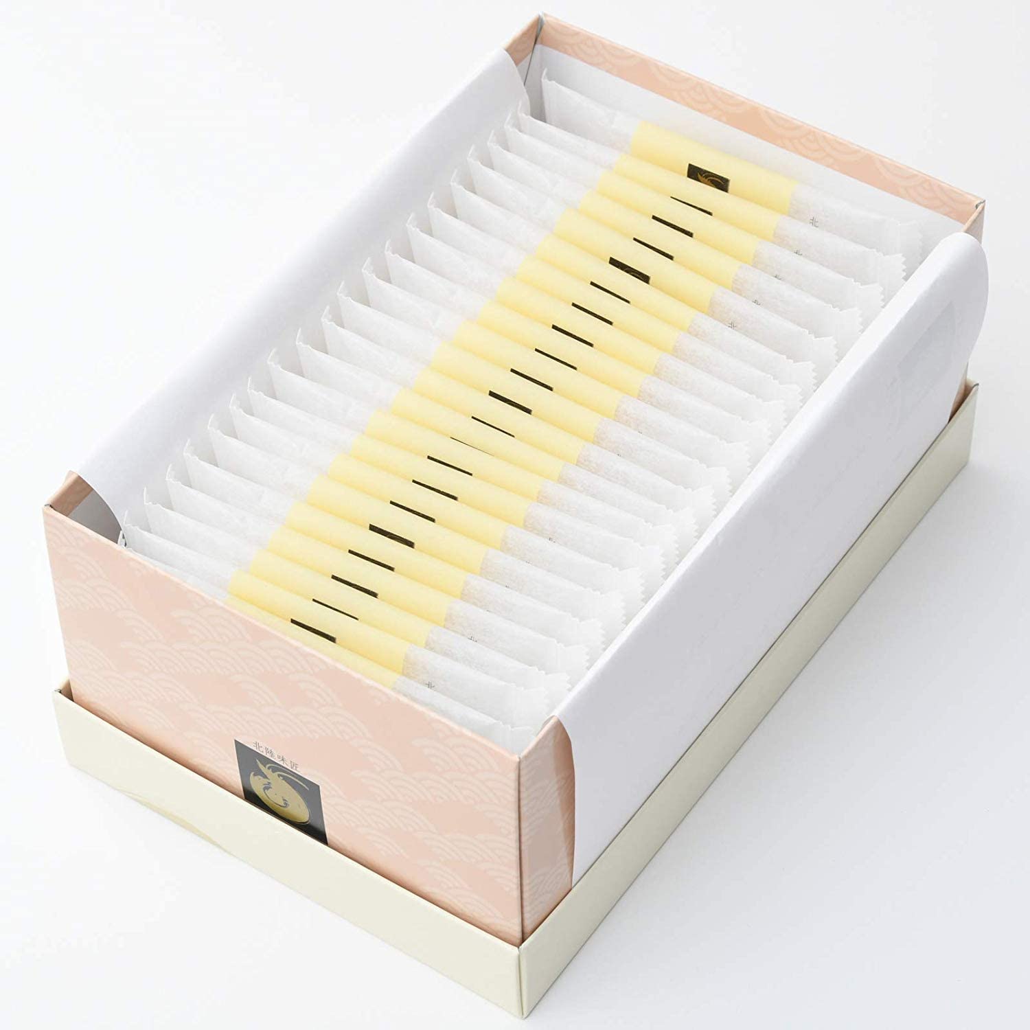 富山の特産品である白えびを、えびの割合として60%使用し生地に練り込んであります。その上から米粉(富山うるち米)や特製タレを塗ってあり、低温でじっくり焼くことにより、香り・風味・口どけ感を重視したこだわりせんべいです。五十年以上せんべい一筋に賭けてきた職人が丁寧に焼き上げました。