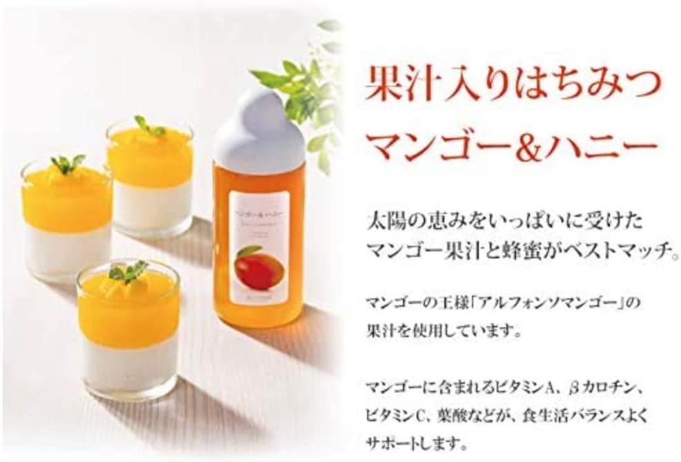 南国の果物の王様マンゴーの果汁と蜂蜜がベストマッチ。 蜂蜜と果汁の組み合わせで、バランスの良い健やかな毎日を。 果汁蜜シリーズには、栄養たっぷりの蜂蜜とビタミンがバランス良く含まれています。 マンゴー&ハニーは、フルーツ王国のインド産マンゴーの中でも、王様といわれている、「アルフォンソマンゴー」の果汁を使用しています。 マンゴーにはビタミンA,βカロチン、ビタミンC、葉酸が含まれており、緑黄色野菜の栄養成分を手軽に摂取したい方にお勧めです。 毎日のバランスよい食生活をサポートする食品です。 ジャム、ジュース、マンゴープリンの材料としてもお使い頂けます。 ※果汁由来の成分が浮遊・沈殿することがあります。また、はちみつと果汁が分離することがありますが、品質上問題はありません。良く振ってご利用ください。