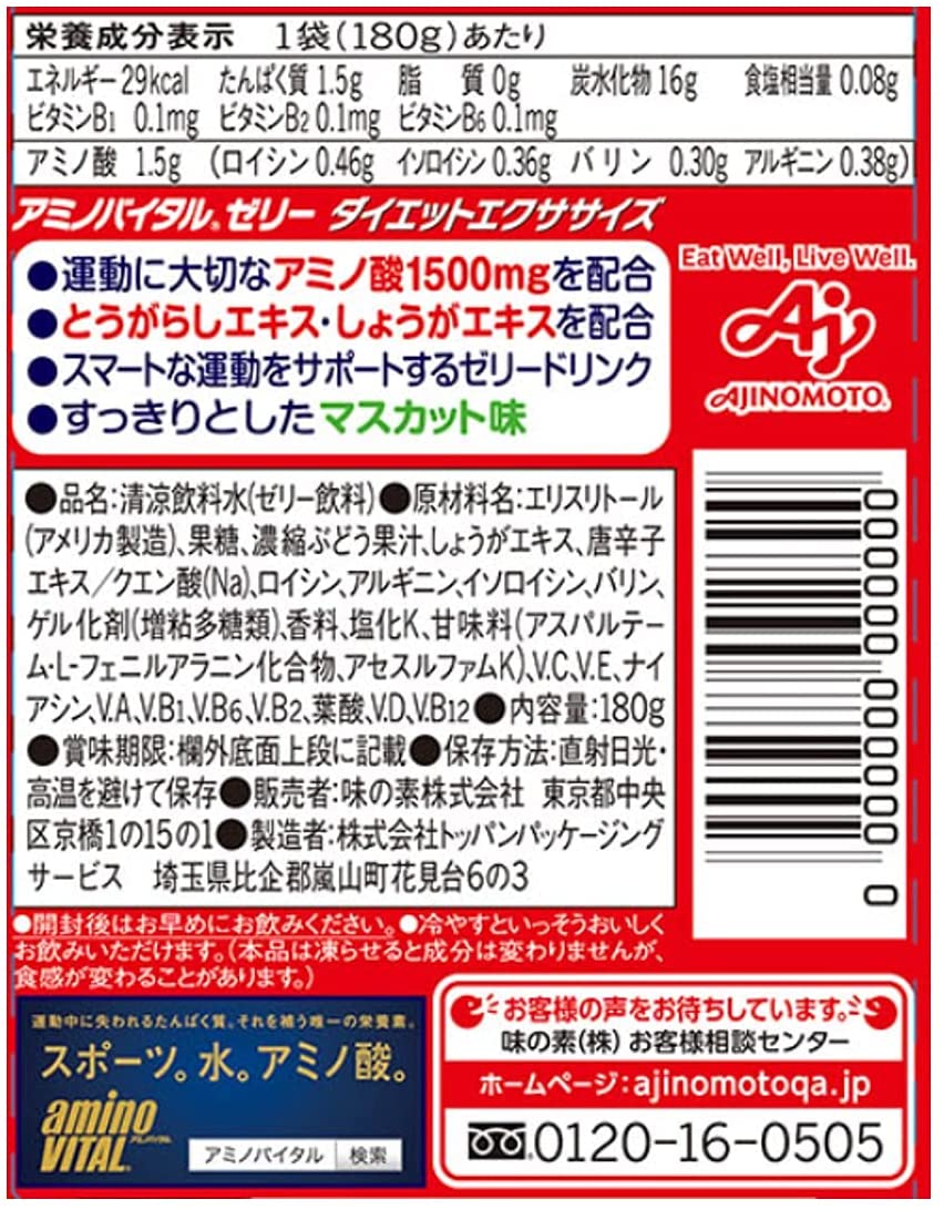 サイズ:6個商品紹介商品紹介燃焼アミノ酸1500mg、ビタミンB群3種、とうがらし抽出物を配合。エネルギー29Kcalでカロリーオフ。すっきりとしたマスカット味(果汁1%)。栄養成分【1袋当たり】エネルギー:29kcal、たんぱく質:1.5g、脂質:0g、炭水化物:16g、食塩相当量:0.08g、ビタミンB1:0.1mg、ビタミンB2:0.1mg、ビタミンB6:0.1mgアミノ酸:1.5g(ロイシン:0.46g、イソロイシン:0.36g、バリン:0.30g、アルギニン:0.38g) アレルギー物質―使用上の注意開封後はお早めにお飲みください。ご注意(免責)>必ずお読みくださいご注意(免責)> 必ずお読み下さい 在庫完売の際は、お取寄せ又はキャンセルとなる場合がございます。また、配送予定日と弊社商品お届け予定日は異なる場合もございますので予めご了承下さい。 商品は予告なくパッケージ変更の場合もあります。※お客様都合によるご返品はお受けできません