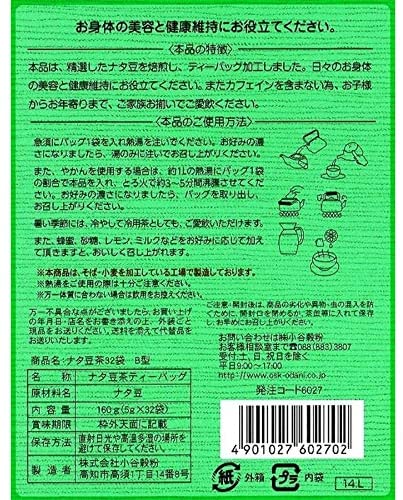 パターン名(種類):02セット商品の説明お身体のお掃除とリフレッシュを… 食品添加物氾濫時代におすすめ致します。 本品は、精選したナタ豆を焙煎し、ティーバック加工しました。 日々のお身体の美容と健康維持にお役立て下さい。 カフェインを含まないため、お子様からお年寄りまで、ご家族お揃いでご愛飲下さい。 商品名;ナタ豆茶32袋、名称:ナタ豆茶ティーバック 原材料名:ナタ豆 内容量:160g(5g×32袋) 保存方法:直射日光や高温多湿の場所を避けて保存して下さい。 国内(焙煎、パック加工)、無漂白ペーパー使用原材料・成分ナタ豆