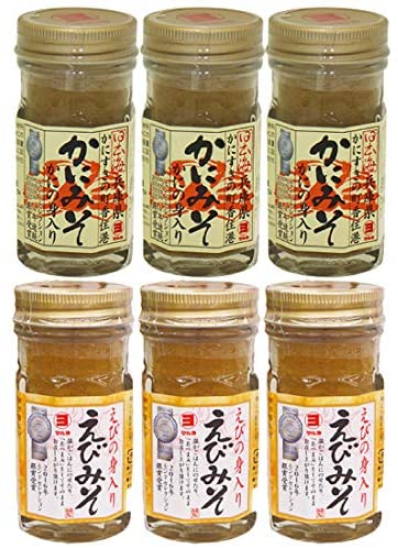 ・マルヨ食品「かにの身入りかにみそ 60g」「えびの身入りえびみそ 60g」各3本ずつ、計6本のセットです。