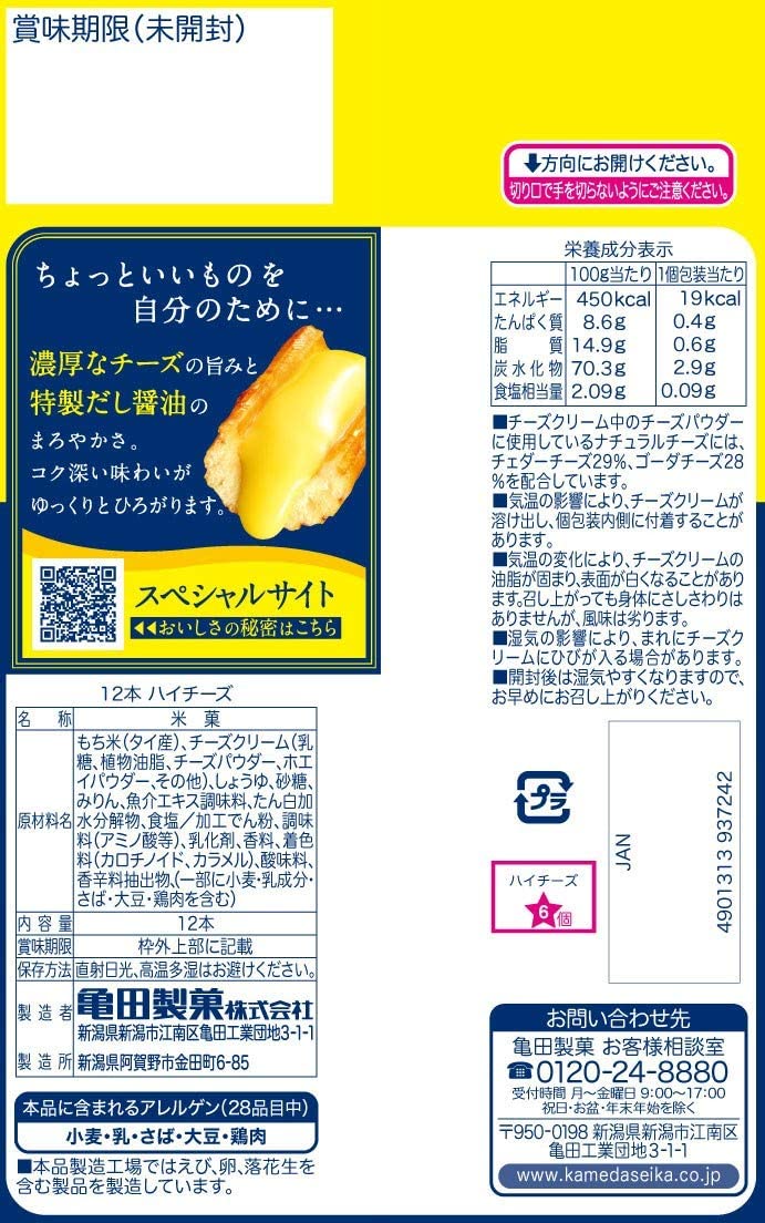 ・原材料:もち米(タイ産)、チーズクリーム(乳糖、植物油脂、チーズパウダー、ホエイパウダー、その他)、しょうゆ、砂糖、みりん、魚介エキス調味料、たん白加水分解物、食塩/加工でん粉、調味料(アミノ酸等)、乳化剤、香料、着色料(カロチノイド、カラメル)、酸味料、香辛料抽出物、(一部に小麦・乳成分・さば・大豆・鶏肉を含む)