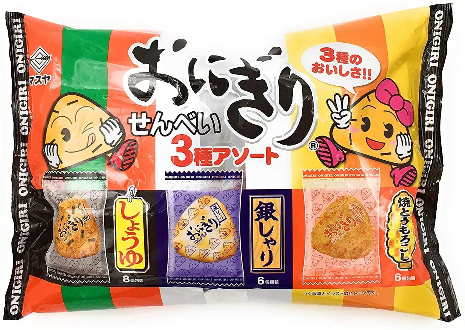 商品の説明【まとめ買い】マスヤ おにぎりせんべい 3種アソート 20枚入 [しょうゆ8枚・銀しゃり6枚・焼きとうもろこし6枚] ×2袋 【3種のおいしさ食べくらべ!!】おにぎりせんべいのアソートが個包装になりました! おにぎりせんべいは、お馴染みの「しょうゆ味」につづき、つぶ塩が決めての「銀しゃり」とアソートでしか味わえない「焼とうもろこし」を発売。 それぞれ個包装になった3種類の美味しさをお楽しみください。原材料・成分【しょうゆ】 うるち米(アメリカ産、国産)、植物油、しょうゆ、砂糖、デキストリン、海苔、卵黄パウダー、ポークエキス/加工でん粉、調味料(アミノ酸等)、乳化剤、酸化防止剤(ビタミンE)、パプリカ色素、(一部に卵・小麦・大豆・豚肉・ごまを含む) 【銀しゃり】 うるち米(アメリカ産、国産)、植物油、還元水あめ、食塩/調味料(アミノ酸等)、香料、酸化防止剤(ビタミンE)、(一部に大豆を含む) 【焼とうもろこし】 うるち米(アメリカ産、国産)、植物油、しょうゆ、砂糖、デキストリン、焼きとうもろこしシーズニング、卵黄パウダー、ポークエキス/加工でん粉、調味料(アミノ酸等)、香料、着色料(パプリカ色素、カラメル色素、アナトー、ウコン)、酸化防止剤(ビタミンE)、甘味料(ステビア、カンゾウ)、(一部に卵・乳成分・小麦・大豆・豚肉・ごまを含む)
