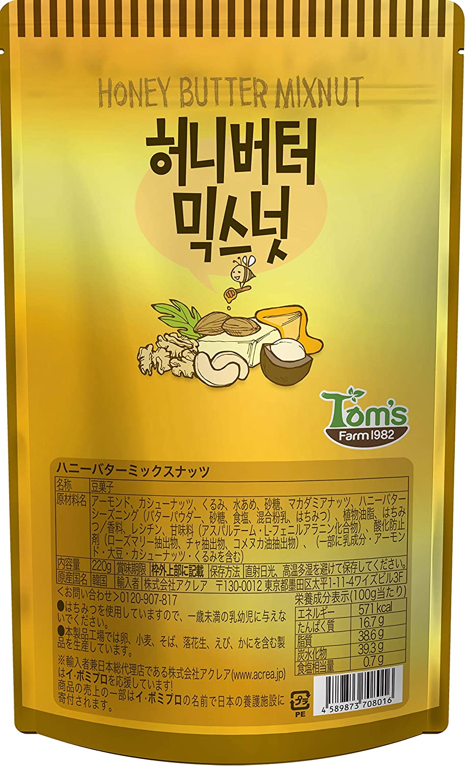 韓国ギリム社から日本国内正規代理店の㈱アクレアの商品となります。類似品にお気をつけください。 ・原材料名 アーモンド,カシューナッツ,クルミ,水あめ,砂糖,マカダミアナッツ,ハニーバターシーズニング(バターパウダー,砂糖,食塩,混合粉乳,はちみつ),植物油,はちみつ/香料,レシチン,甘味料(アスパルテーム,L-フェニルアラニン化合物),(一部に乳成分・アーモンド・大豆・カシューナッツ・くるみを含む) ※はちみつを使用していますので、一歳未満の乳幼児に与えないでください。 本製品は落花生,小麦,卵,豚肉を含む製品と共通の設備で製造しています。 【原産国】韓国