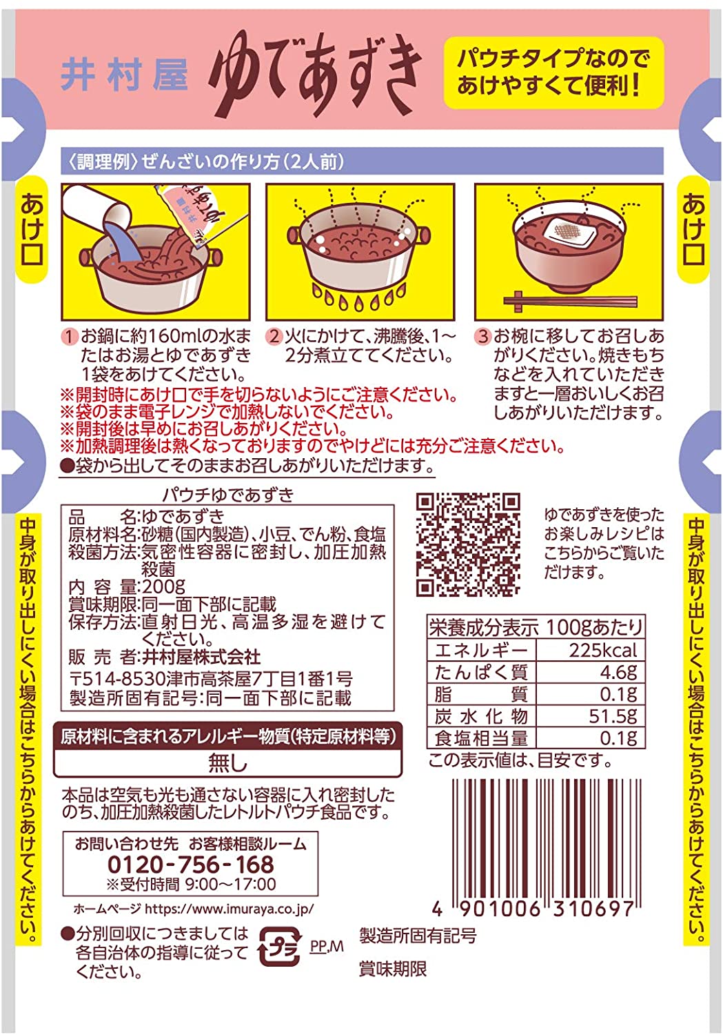 缶切り不要、開けやすく、使いやすいパウチ容器入りの、小豆の風味豊かなゆであずきです。本品1袋で、ぜんざいなら2人前、焼餅や白玉を入れてもお楽しみいただけます。井村屋株式会社は安全、安心な商品を安定してお届けし、お客様の食生活においしいの笑顔の輪を広げ続けることを最重要に経営課題として運営している会社です。菓子、食品、デイリーチルド、アイスクリーム、冷凍食品と全温度帯で商品を販売しており、どこでも、いつでも井村屋商品があることを目指しております。
