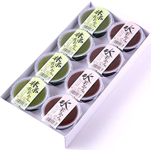 ・【仕様】■品名:小豆水羊羹、抹茶水羊羹■名称:水羊羹■原材料名:【小豆】小豆、砂糖、還元水飴、寒天、トレハロース、増粘多糖類【抹茶】白隠元豆、砂糖、還元水飴、寒天、抹茶、食塩、トレハロース、増粘多糖類、着色料(クチナシ色素)■内容量:水ようかん2種合計8個(小豆×4個、抹茶×4個) ■【外箱サイズ】縦: 約31cm横: 約16cm厚み: 約4.5cm●生産地日本