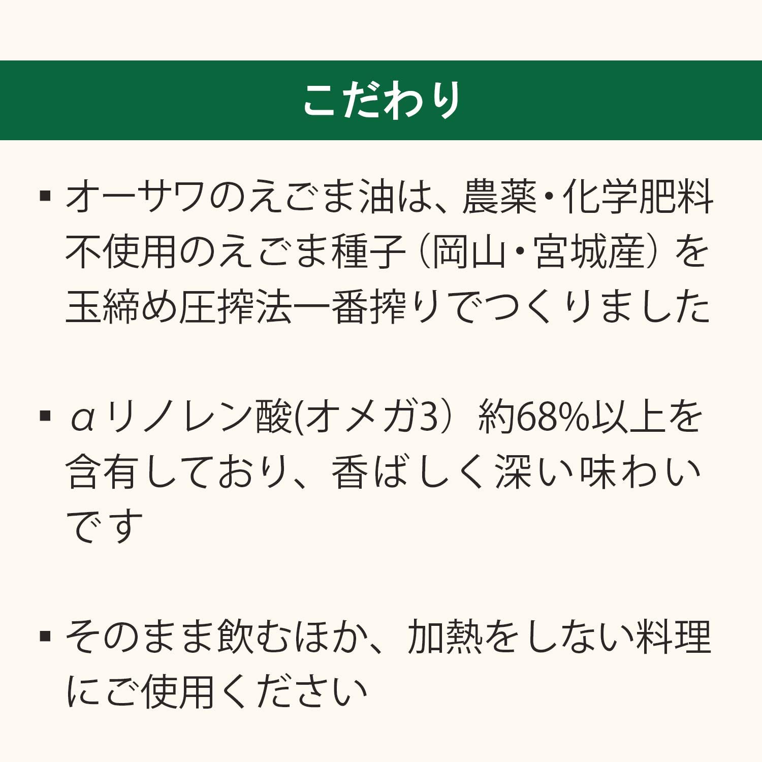商品の説明●えごまは別名ジュウネンと呼ばれるシソ科の一年草です。 ●無添加・無着色です。 ●製法は玉締め(冷圧搾法)の一番搾り。 ●1日10~15mlを目安にそのままお飲みいただけます。 ●ドレッシング、マリネ等加熱しない料理におすすめです。 ●αリノレン酸(オメガ3)68%以上含有。原材料・成分えごま使用方法■そのまま飲むほか、加熱を しない料理にも続きを見る
