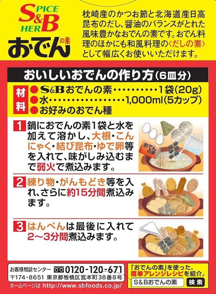 枕崎産のかつお節と北海道産日高昆布のだし、醤油のバランスがとれた風味豊かなおでんの素です。おでん料理のほかにも炊き込みご飯、茶わん蒸し、うどん、煮もの、鍋もの等の和風料理の〈だしの素〉として幅広くお使いいただけます。【おいしいおでんの作り方(6皿分)】【材料】●S&Bおでんの素…1袋(20g)●水………………1,000ml(5カップ)●お好みのおでん種1鍋におでんの素1袋と水を加えて溶かし、大根・こんにゃく・結び昆布・ゆで卵等を入れて、味がしみ込むまで弱火で煮込みます。2練り物・がんもどき等を入れ、さらに約15分間煮込みます。3はんぺんは最後に入れて2~3分間煮込みます。