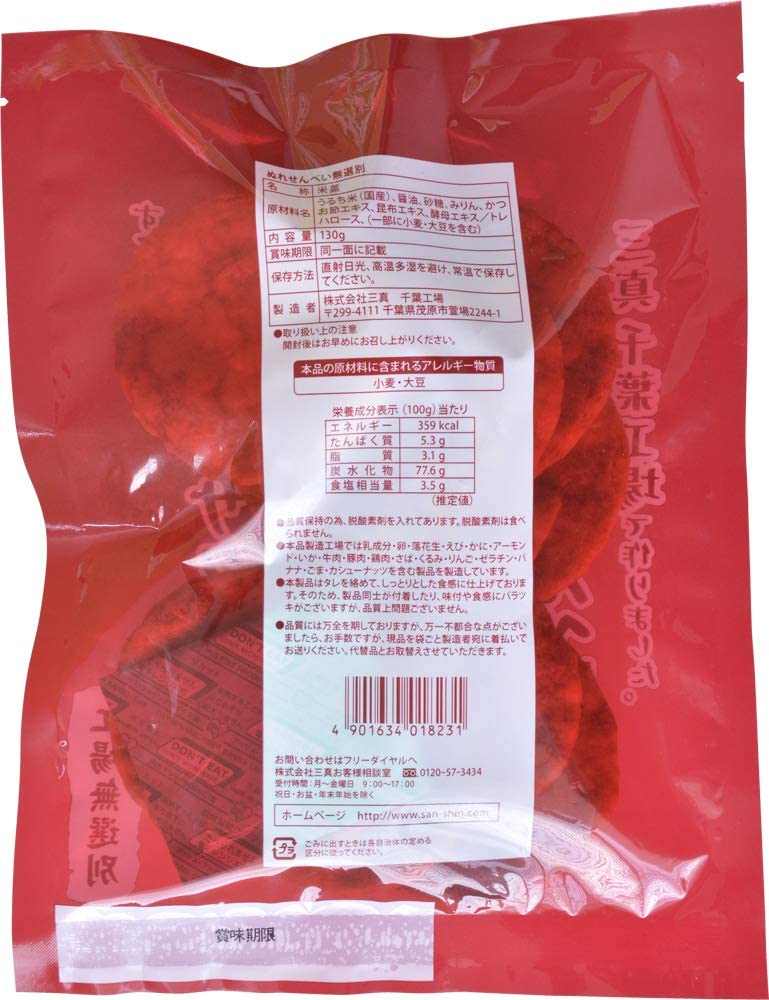 大判のぬれせんべいを徳用サイズで用意しました。国産米の生地に千葉の醤油を合わせたこだわりの逸品です。本品製造工場では乳成分・卵・落花生・えび・かに・アーモンド・いか・牛肉・豚肉・鶏肉・さば・くるみ・りんご・ゼラチン・バナナ・ごま・カシューナッツを含む製品を製造しています。品質保持の為、脱酸素剤を入れてあります。脱酸素剤は食べられません。本製品はタレを絡めて、しっとりとした食感に仕上げております。そのため、製品同士が付着したり、味付や食感にバラツキがございますが、品質上問題ございません。