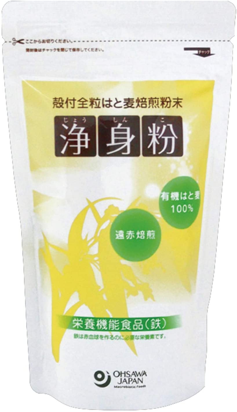 商品の説明はと麦を丸ごと焙煎し粉末にした浄身粉は、鉄分や食物繊維を多く含んだ、香ばしく美味しい栄養機能食品です。 ココアとメープルシロップを加えペースト状にしパンと一緒に、または豆乳やきな粉に入れて召し上がるのもおすすめです。 ・栄養機能食品(鉄) [鉄は赤血球を作るのに必要な栄養素です。] ・外殻・外皮・胚芽等を含んだ全粒はと麦を、遠赤外線で焙煎し粉末にした ・香ばしく食べやすい ・鉄分含有量 2.4mg/10g ・1日10gを目安に 40kcal/100g 原材料 有機はと麦(ラオス産)原材料・成分有機はと麦(ラオス産)