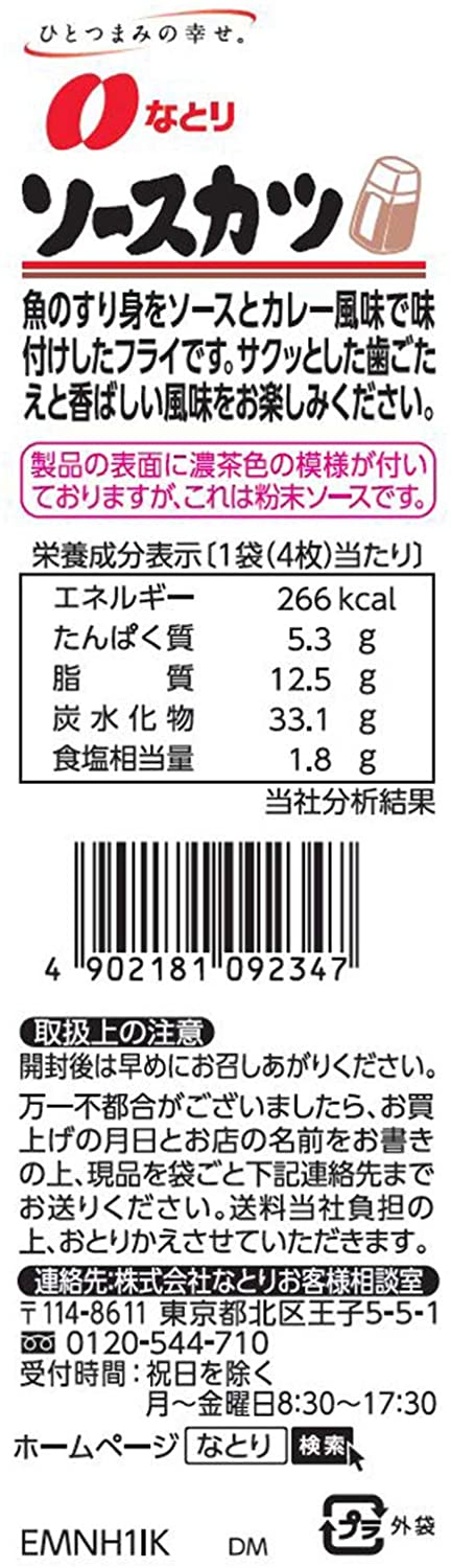 ・原材料:パン粉、植物油、小麦粉、魚肉シート(魚肉すり身、卵、その他)、でん粉、食塩、ショートニング、卵白、粉末ソース(大豆・りんごを含む)、香辛料、乳等を主要原料とする食品、ポークエキス(ゼラチンを含む)/ソルビトール、グリセリン、加工でん粉、調味料(アミノ酸等)、乳化剤、トレハロース、着色料(カラメル、カロチノイド)、酸味料、膨脹剤、甘味料(ステビア、カンゾウ)、香辛料抽出物、香料