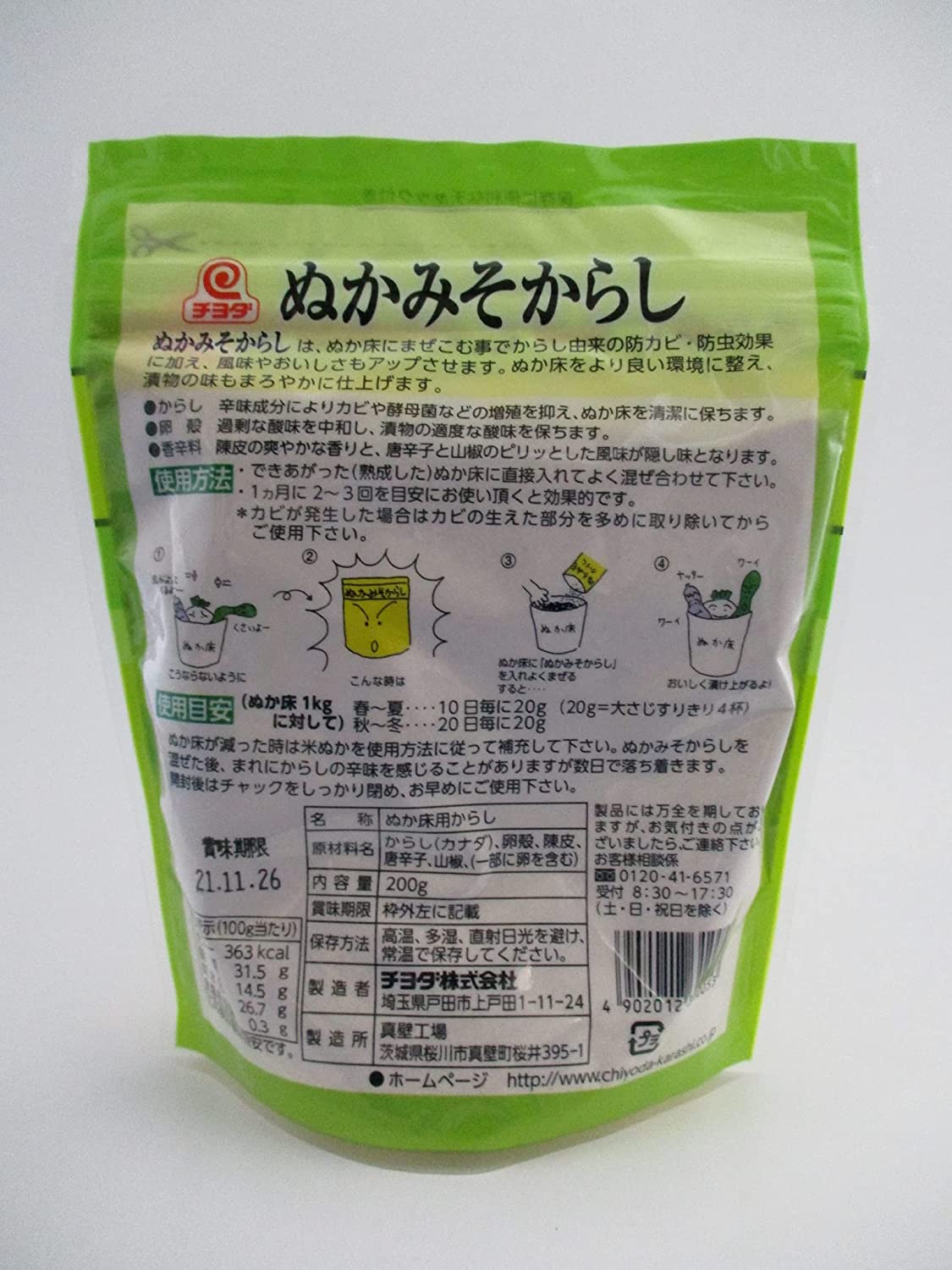商品紹介主婦の知恵から生まれた商品です。ぬか床本体、補充用ぬかとは異なります。・ぬか漬け自体がすっぱくなってしまった時に、ぬかみそからしを混ぜ込む事でぬか漬けのすっぱさを和らげる事ができます。・ぬか床に混ぜ込む事でぬか床のカビやぬか床に寄ってくる虫を防ぎます。ぬか床からの気になるにおい(不快なにおい)がピタリととまります。100g当たり:熱量363kcal、たんぱく質31.5g、脂質14.5g、炭水化物26.7g、食塩相当量0.3g使用方法ぬか床に入れてよく混ぜ合わせてください。