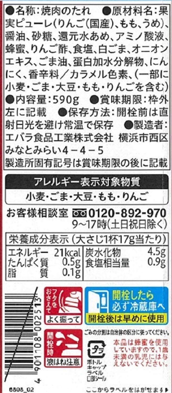 ・原材料:果実ピューレ(りんご(国産)、もも、うめ)、醤油、砂糖、還元水あめ、アミノ酸液、蜂蜜、りんご酢、食塩、白ごま、オニオンエキス、ごま油、蛋白加水分解物、にんにく、香辛料/カラメル色素、(一部に小麦・ごま・大豆・もも・りんごを含む)