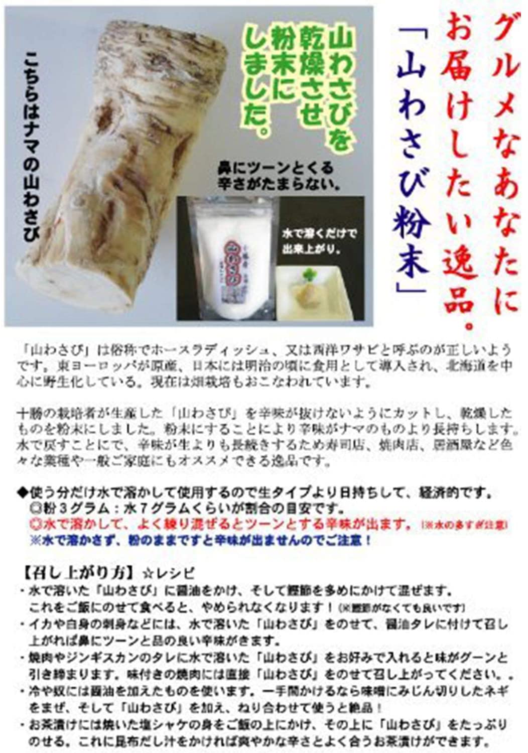 生の山わさびをスライス、乾燥、粉末にした自慢の商品です。 水に溶くだけで激辛がよみがえります! ドレッシングにまぜたり、おそばや納豆、冷奴、刺身、ステーキなど 様々なシーンで活躍します★ ジッパー付き袋なのでそのまま保存でき便利です。
