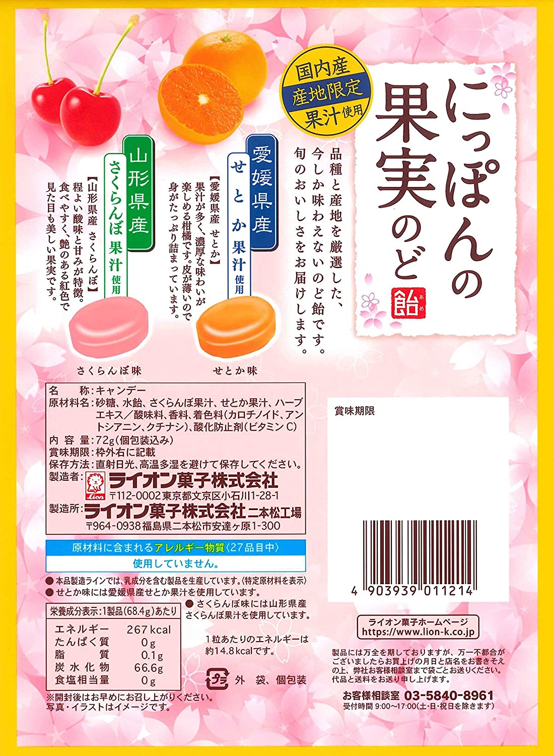 ライオン菓子 にっぽんの果実のど飴(せとかとさくらんぼ) 72g ×6袋
