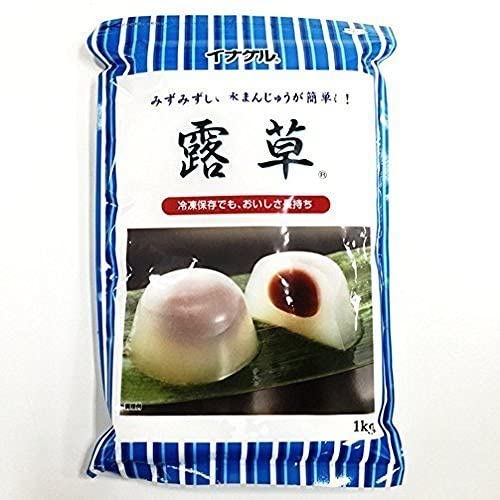 パターン:1kg袋単品本葛粉を使用した充填タイプの業務用水まんじゅうの素です。【やわらか食感配合】露草…90g、グラニュー糖…300g、水…760g【しっかり食感配合】露草…100g、グラニュー糖…320g、水…730g【レシピ】(1)露草とグラニュー糖を乾いたボウルの中でダマにならないようによく混ぜ合わせ、鍋に張った水の中に溶き入れます。(2)火にかけ軽く沸騰するくらいの火加減で焦げ付かないように練り上げます。(3)型に少量の生地を入れ、あらかじめ丸めておいた餡玉を乗せ、その上からさらに生地を流し入れます。(4)冷蔵庫などで約2時間冷やし固め、型から取り出します。