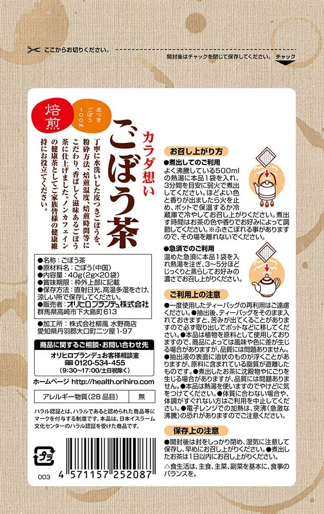 商品紹介・皮つきごぼうをそのまま使用しています。野菜や果物など皮の部分にはポリフェノールなどの健康成分が不ままれていることが知られています。ごぼうの成分をそのまま摂取できるよう、ごぼうを丸ごと皮まで使用しています。ごぼうは食物繊維やポリフェオールを含み健康力の強い野菜の1つです。ノンカフェイン、残留農薬323種類検査済み原材料・成分ごぼう使用方法<煮出してご利用の場合>よく沸騰している500mlの熱湯に本品1袋を入れ、3分間を目安に弱火で煮出してください。ほどよい色と香りが出ましたら火を止め、ポットで保温するか冷蔵庫で冷やしてお召し上がりください。煮出す時間はお茶の色や香りでお好みによって調節してください。※ふきこぼれる事がありますので、その場を離れないでください。<急須をご使用の場合>温めた急須に本品1袋を入れ熱湯を注ぎ、3~5分ほどじっくりと蒸らしてお好みの濃さでお召し上がりください。続きを見る