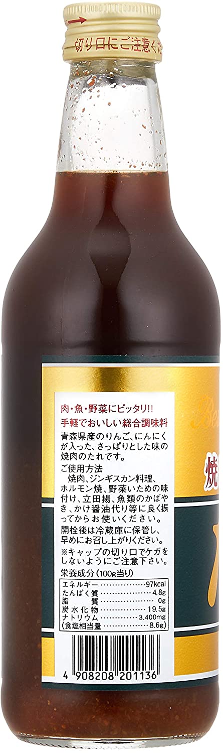自社醸造の醤油は大豆も小麦も青森県産。加えてりんごとにんにくも青森県産と青森のソウルフードにふさわしい原材料にこだわっております。更にノンオイルの焼きタレ。醤油代わりに魚料理にもお勧めでございます。栄養成分:蛋白質4.8g、炭水化物19.5g、食塩相当量8.6g