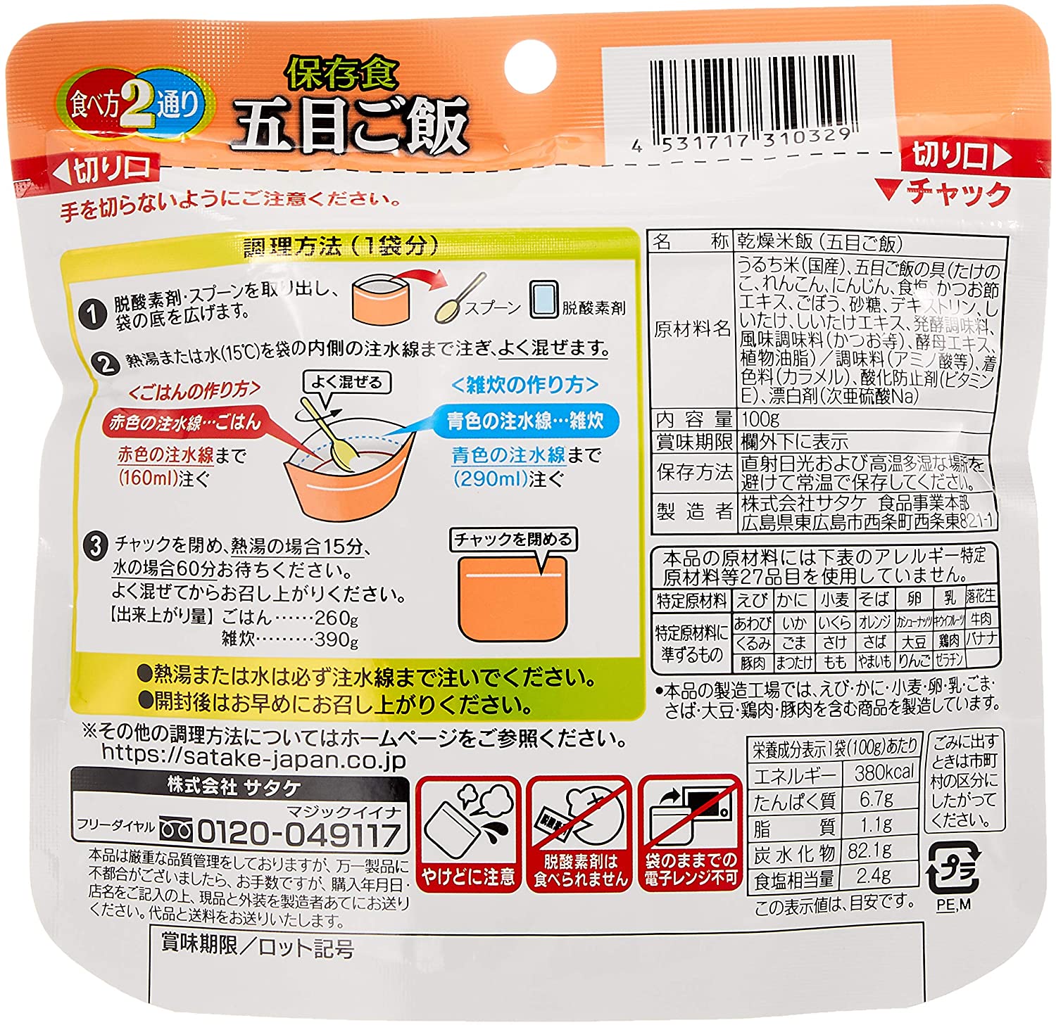 ・原材料:うるち米(国産)、五目ご飯の具(たけのこ、れんこん、にんじん、食塩、かつお節エキス、ごぼう、砂糖、デキストリン、しいたけ、しいたけエキス、発酵調味料、風味調味料(かつお等)、酵母エキス、植物油脂)/調味料(アミノ酸等)、着色料(カラメル)、酸化防止剤(ビタミンE)、漂白剤(次亜硫酸Na)