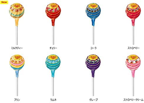 チュッパチャプスの人気フレーバーをアソート(全8フレーバー) コーラ・グレープ・ラムネ・ストロベリークリーム・プリン・ストロベリーと期間限定2種の8種類のフレーバーです。 気分や好みに応じて楽しめる。 世界で一番売れているロリポップキャンディです。 お菓子は8種類の味がありますが全種類入っていない場合があります。