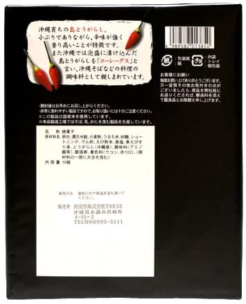 ・原材料:原材料:卵白、還元水飴、小麦粉、うるち米、砂糖、ショートニング、でん粉、えび粉末、食塩、車えびすり身、とうがらし(沖縄産)、調味料(アミノ酸等)、膨張剤、着色料(ウコン、赤102)、(原材料の一部に大豆を含む)