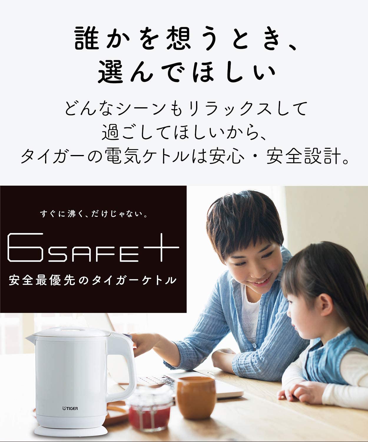 サイズ名:800ml?|?色名:ブラック?|?パターン名(種類):単品■商品情報 PCH-G080-KP ・容量:0.8L ・商品サイズ本体:)幅14.8×奥行22.6×高さ21.5cm ・本体質量:(約)1.03kg ・沸とう時間:(約)カップ1杯(140mL)45秒、満水(0.8L)4分 ・湯わかし時の消費電力1300W ・電源コード(約) 1.3m 飲みたい時にサッと沸く! 好評の安全性に加えさらに沸とう時間の短縮と節電を両立。 タイガー電気ケトルの安全性が高く評価され、キッズデザイン賞(2013)を受賞しました。 ■6つの安心・安全構造 安全最優先のタイガーケトル 6SAFE+ 1「転倒お湯漏れ防止構造」 万一倒れてもお湯もれをおさえる構造です。 2「給湯ロックボタン」 ワンタッチで開閉できるロックをすれば万一倒れてもお湯もれを最小限におさえます。 3「本体二重構造」 鋼板ケースとステンレス製内容器の二重構造で、本体が熱くならず安心。 沸かしたお湯も冷めにくく保温性にもすぐれています。 4「カラだき防止」 カラだきを検知して自動オフ。お湯がない状態でのカラだきを防ぎます。 5沸とうすれば「通電自動オフ」? 沸とうすると、からだきを検知した時、スイッチが自動的にオフして電源が切れます。 6「蒸気レスの電気ケトル」 「蒸気キャッチャー構造」搭載。蒸気を外に出さずやけどをするおそれがありません。 蒸気によるお部屋やインテリアへのダメージがなく、置き場所がより自由に選べます。 ■毎日使うものだから“使いやすさ"で選ぶ ・業界最速※ 沸とう完了までカップ1杯分が約45秒 ※2020年9月23日現在 家庭用電気ケトルにおいて、水温・室温23度、定格消費電力にてカップ1杯分約140mLの沸とう時間(自社測定法) ・業界No.1節電沸とう 湯わかし電力を約22%※カット ※ 当社従来品PCH-A型(2012年製)との比較 少しだけすぐに沸かしたいときに沸とうをすばやく検知して無駄な加熱を行なわずストップさせます。 ・ワンタッチ着脱ふた ワンタッチで簡単にふたがはずせるので、給水やお手入れらくらく。 ・「広口フッ素加工内容器」