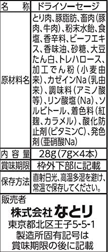 ・原材料:とり肉・豚脂肪・畜肉(豚肉・牛肉)・粉末水飴・食塩・香辛料・ビーフエキス・香味油・砂糖・大豆たん白・トレハロース・加工でん粉(小麦由来)・カゼインNa(乳由来)・調味料(アミノ酸等)・リン酸塩(Na)・ソルビトール・着色料(紅麹・カラメル)・酸化防止剤(ビタミンC)・発色剤(亜硝酸Na)