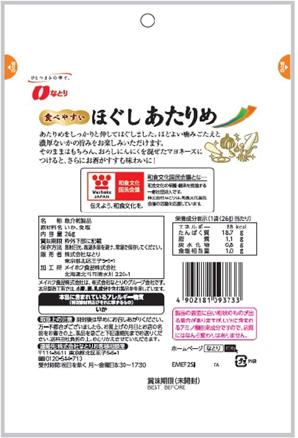 するめいかを使用したあたりめをしっかりと伸してほぐしました。ほどよい噛み応えと濃厚ないかの旨みをお楽しみいただけます。そのままはもちろん、おろしにんにくを混ぜ合わせたマヨネーズにつけると、さらにお酒がすすむ味わいとなります。従来のあたりめを、硬くて食べにくいと感じていらっしゃった方に是非とも食べていただきたいほぐしあたりめです。1袋(26g)当たり:エネルギー88kcal たんぱく質 18.7g 脂質 1.1g 炭水化物 0.8g 食塩相当量 1.0g