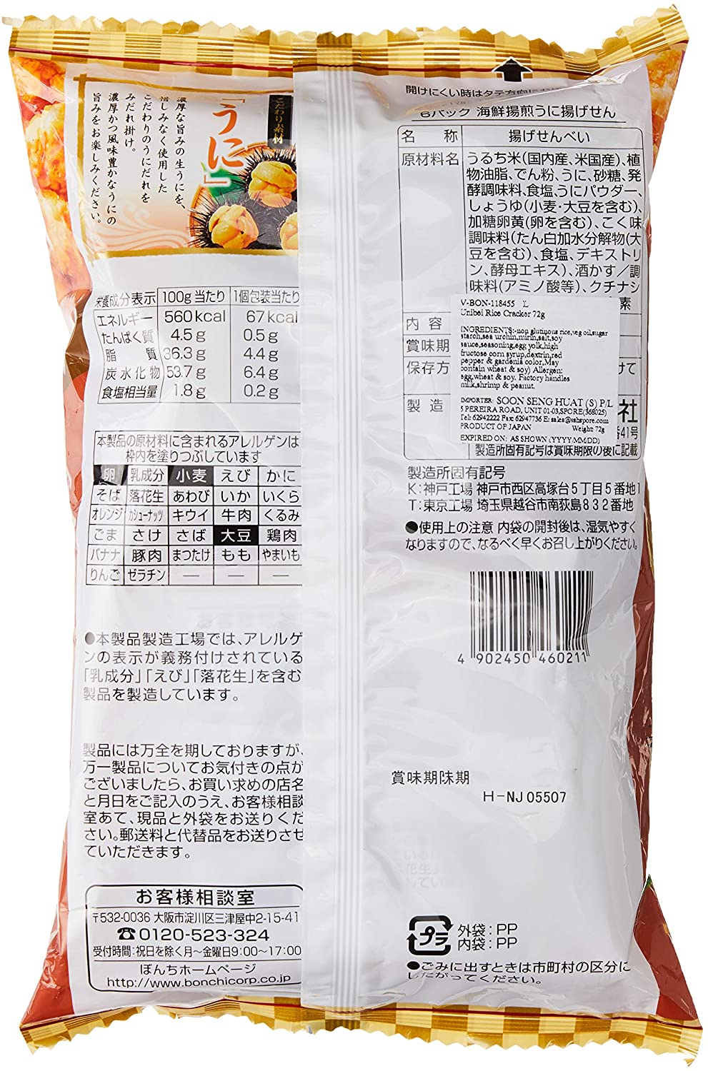 ・原材料:うるち米(国内産、米国産)、植物油脂、でん粉、うに、砂糖、発酵調味料、食塩、うにパウダー、しょうゆ(小麦・大豆を含む)、加糖卵黄(卵を含む)、こく調味料(たん白加水分解物(大豆を含む)、食塩、デキストリン、酵母エキス)、酒かす/調味料(アミノ酸等)、クチナシ色素、香料、トウガラシ色素