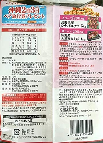 ・原材料:米(中国産、日本産、アメリカ産)、植物油脂、海老、食塩、砂糖、エビエキスパウダー、デキストリン、たんぱく加水分解物(小麦・大豆を含む)、魚介エキスパウダー、加工でん粉、調味料(アミノ酸等)、紅麹色素、植物レシチン(大豆由来)