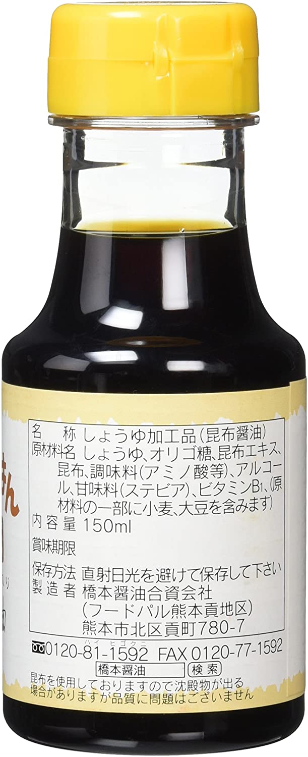・原材料:しょうゆ(国内製造)、オリゴ糖、昆布エキス、昆布/アルコール、調味料(アミノ酸等)、甘味料(ステビア)、ビタミンB1、(一部に大豆・小麦を含む)