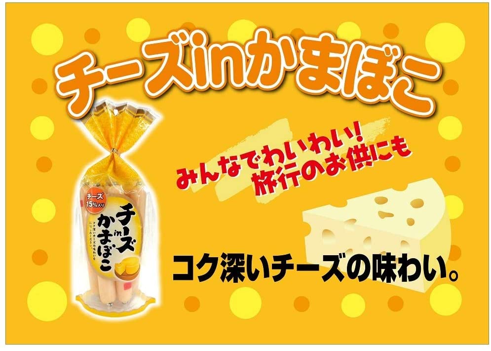 ・原材料:魚肉(たら、エソ)、プロセスチーズ、食塩、砂糖、発酵調味料、卵白/加工でん粉、調味料(アミノ酸等)、乳化剤、リン酸塩(NA)、着色料(カロチノイド)、酸味料、(一部に小麦・卵・乳成分・大豆・鶏肉・豚肉・ゼラチンを含む)
