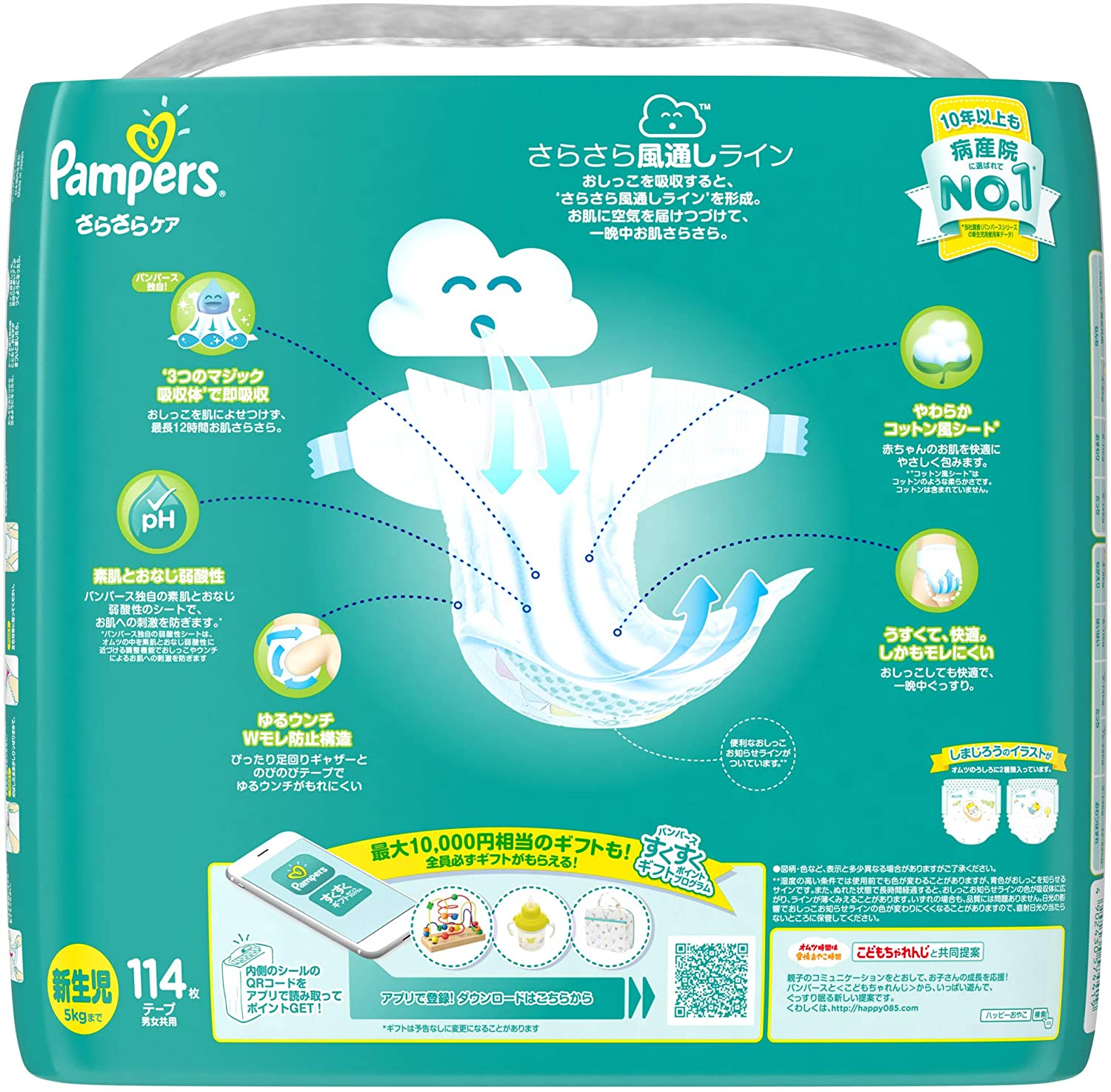 サイズ:342枚(114枚×3)商品紹介生まれたての赤ちゃんの肌はとってもデリケート。 だから 肌にやさしくて かぶれにくい病産院NO.1*に選ばれているパンパースシリーズ。 *当社調査(新生児用使用率データ) 新しいパンパースは、史上初* 超うすさらマジック。 *2016年に'肌へのいちばん'に導入した'3つのマジック吸収体' 新技術。吸収スピード最大2倍*で、お肌さらさら** パンパース独自の「3つのマジック吸収体」で、分散して即吸収。おしっこを肌によせつけず、最長12時間お肌さらさら。 *全サイズ内での最高値 * *当社過去製品比較 新技術。うすくなって、快適 旧製品と比べて、約12%*うすくなりました。しかも、おしっこしてもオムツがうすく快適で、一晩中ぐっすり眠れます。 *使用前の製品の厚さの比較 もちろん、通気性はばっちり。全面通気のおむつでムレを逃がして赤ちゃんのお肌は快適。 やわらかコットンシート* 赤ちゃんのお肌を快適に包みます。 * “コットンシート"はコットンのような肌ざわりのシートです。コットンは含まれていません のびのびストレッチ 2倍のびる のびのびストレッチ (伸ばす前との比較) 動くたびに伸び縮みして、ぴったりフィット。背中のスキマも安心。 最長12時間お肌さらさらで一晩中のゴールデンスリープ使用上の注意使用上の注意 (1)汚れた紙おむつは早くとりかえてください。(2)テープは直接お肌につけないでください。(3)誤って口に入れたり、のどにつまらせることのないよう保管場所に注意し、使用後はすぐに処理してください。 lお肌に合わないときは使用を中止し、医師に相談してください。 ●持ち手を誤って首にひっかけたり、のどに詰まらせたりすることのないように、乳幼児の手の届かないところに保管してください。原材料・成分素材 表面材: ポリオレフィン不織布/ 吸収材: ポリエステル不織布、ポリオレフィン不織布、 綿状パルプ、高分子吸水材/ 防水材: ポリオレフィンフィルム/ 止着材: 粘着テープ・ポリオレフィン/ 伸縮材: 合成ゴム/ 結合材: ホットメルト粘着材続きを見る