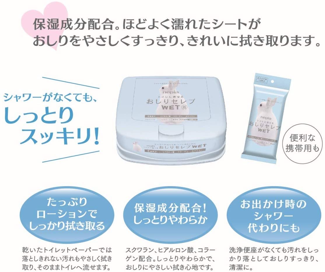 商品紹介シャワーがなくても、しっとりスッキリ!おしりさっぱり、清潔仕上げ!流せるウエットタイプのトイレットペーパーです。●保湿成分配合の、水分たっぷりシートが、トイレットペーパーでは落としきれない汚れをきれいにふき取ります。●おしりだけではなく全身にご使用いただけます。●天然パルプ配合シート採用。ご使用後はトイレに流せます。●パラベンフリー、ノンアルコール、無香料。●詰替用です。使用上の注意・お肌に異常が生じていないかよく注意して使用してください。●お肌に合わないときや使用中、赤味、はれ、かゆみ、刺激、色抜け(白斑等)や、黒ずみ等の異常が出た時、また、使用したお肌に直射日光が当たって同じような異常が出た時は使用を中止し、皮膚科医へ相談してください。使用を続けますと症状を悪化させることがあります。●目のまわりや傷、はれもの、湿疹等の異常があるところには使用しないでください。●シートが乾燥しないように、ご使用後はフタをきちんと閉めてください。●直射日光のあたる場所や高温、凍結のおそれのある場所、乳幼児の手の届く場所には保管しないでください。●シートは破れやすいのでやさしく引き出してください。●皮膚刺激性テスト済みですが、すべての方に刺激が無いわけではありません。●温めるとシートが変色する場合があります。●水分量が多いため、繋がって出ることがあります、その際は手を添えて1枚引き出してください。●トイレのつまりをさけるため、シートは1~2枚ずつ流してください。●トイレに流す場合は「大」の水量で流してください。水流が弱いとトイレにつまる可能性があります。原材料・成分水、DPG、セチルピリジニウムクロリド、安息香酸、ポリアミノプロピルビグアニド、PEG-60水添ヒマシ油、リン酸2Na、EDTA-2Na、チャ葉エキス、ヒアルロン酸Na、水溶性コラーゲン、スクワラン、BG続きを見る