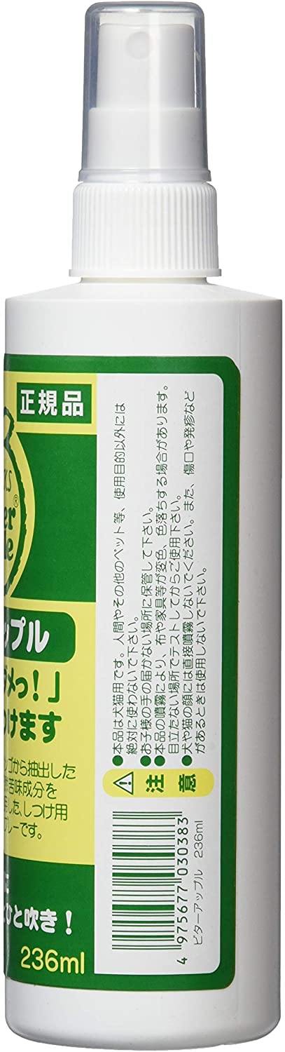 犬猫にいたずらされて困る場所にスプレーすることで、犬猫のいたずらを防止します。・ リンゴから抽出した苦味成分が、犬猫に苦味を覚えさせます。