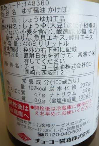 商品の説明あっさりとした酸味のゆず醤油です。本醸造丸大豆うすくち醤油をベースに、高知県産のゆず果汁を使用した、つけ・かけ専用『ゆず醤油』です。 マイルドな味わいのうすいろタイプですので、お料理の味や色をそこなうことなく一層おいしくいただけます。 ■製造元:チョーコー醤油 ■生産地:長崎県 ■容量:400ml原材料・成分■原材料名:しょうゆ(大豆(遺伝子組み換えでない)・小麦を含む)・醸造酢・砂糖・ゆず果汁・みりん・魚貝エキス・酵母エキス安全警告<ご注意> 開栓後は冷蔵庫に保存のうえお早めにお使い下さい。ご注意(免責)>必ずお読みください■営業時間:平日10:00‐17:00/■当店の定休日は「土・日・祝祭日(GW・お盆・年末年始の長期休暇あり)」となっております。/■商品の発送予定日は注文確定後メールにてお知らせしておりますので必ずご確認下さい。続きを見る