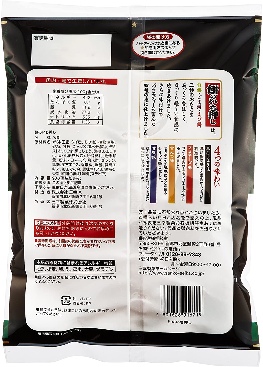 いろいろな味わいが楽しめるぷっくら香ばしいひとくちミックスおかきです。白餅・海老餅・胡麻餅の、3種のお持ちをさっくり軽い食感に焼き上げ、さらに味付けで4種類の味に仕上げました。ミックスになっているのでいろんな方と一緒に楽しんでいただけるアソート米菓になっております。