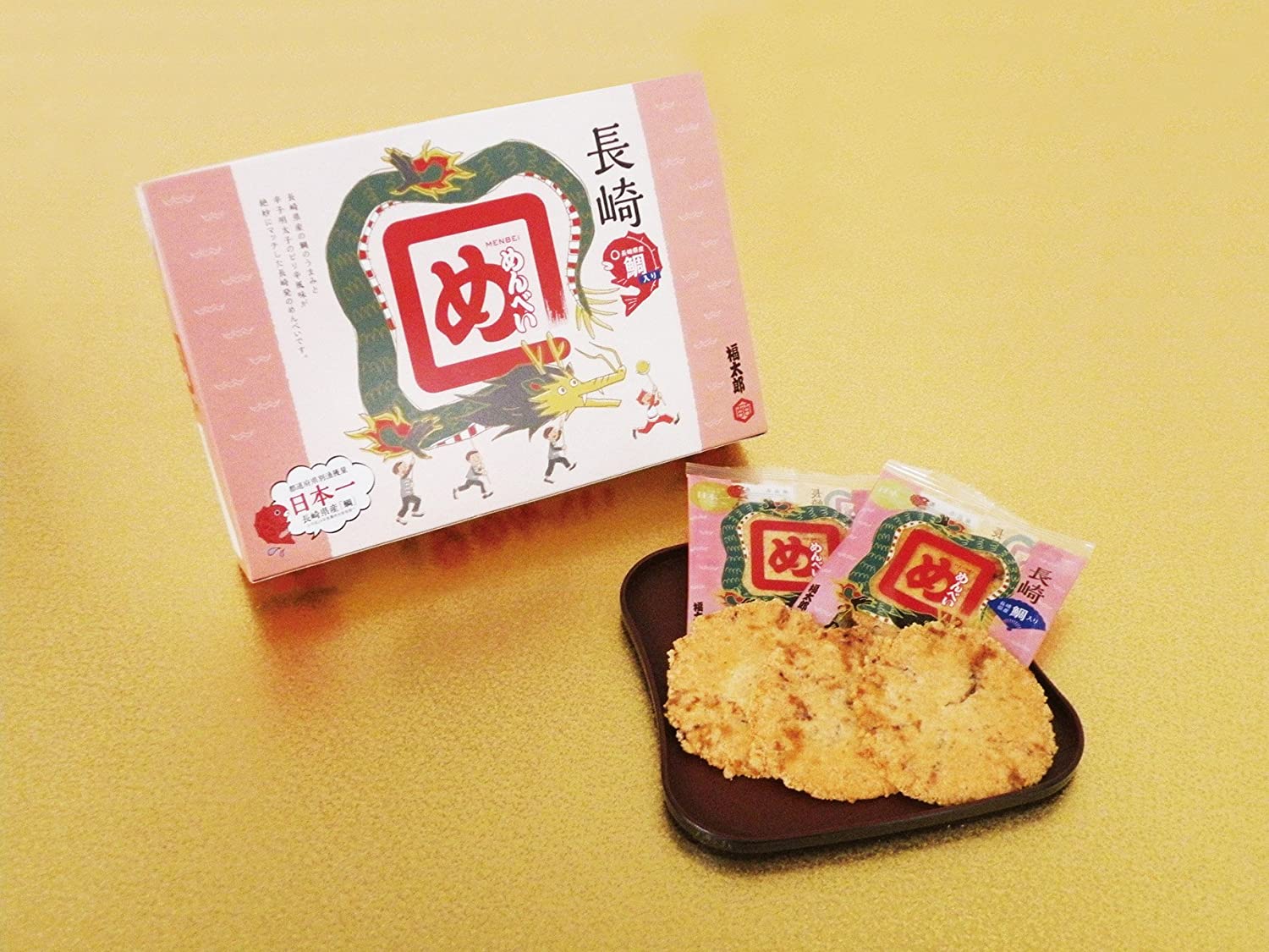 商品紹介大人気、めんべいの長崎限定商品!長崎県は鯛の都道府県別漁獲量が日本一ということから、鯛のすり身を使用し、鯛の香りが食欲をそそるめんべいに仕上げました。パッケージには長崎県の有名な祭り「長崎くんち」の龍踊りをデザインし、よりご当地感を表現しました。裏面には長崎県の特産物や観光名所も掲載しています。ご注意(免責)>必ずお読みくださいアレルギー:小麦、いか、大豆