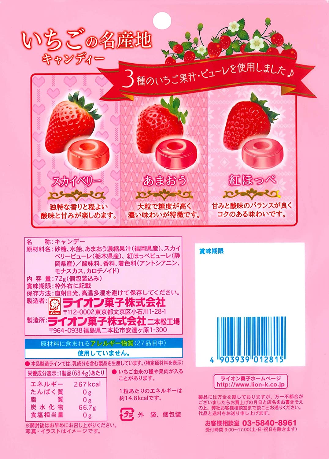 ・原材料:砂糖、水飴、あまおう濃縮果汁(福岡県産)、スカイベリーピューレ(栃木県産)、紅ほっぺピューレ(静岡県産)/酸味料、香料、着色料(アントシアニン、モナスカス、カロチノイド)